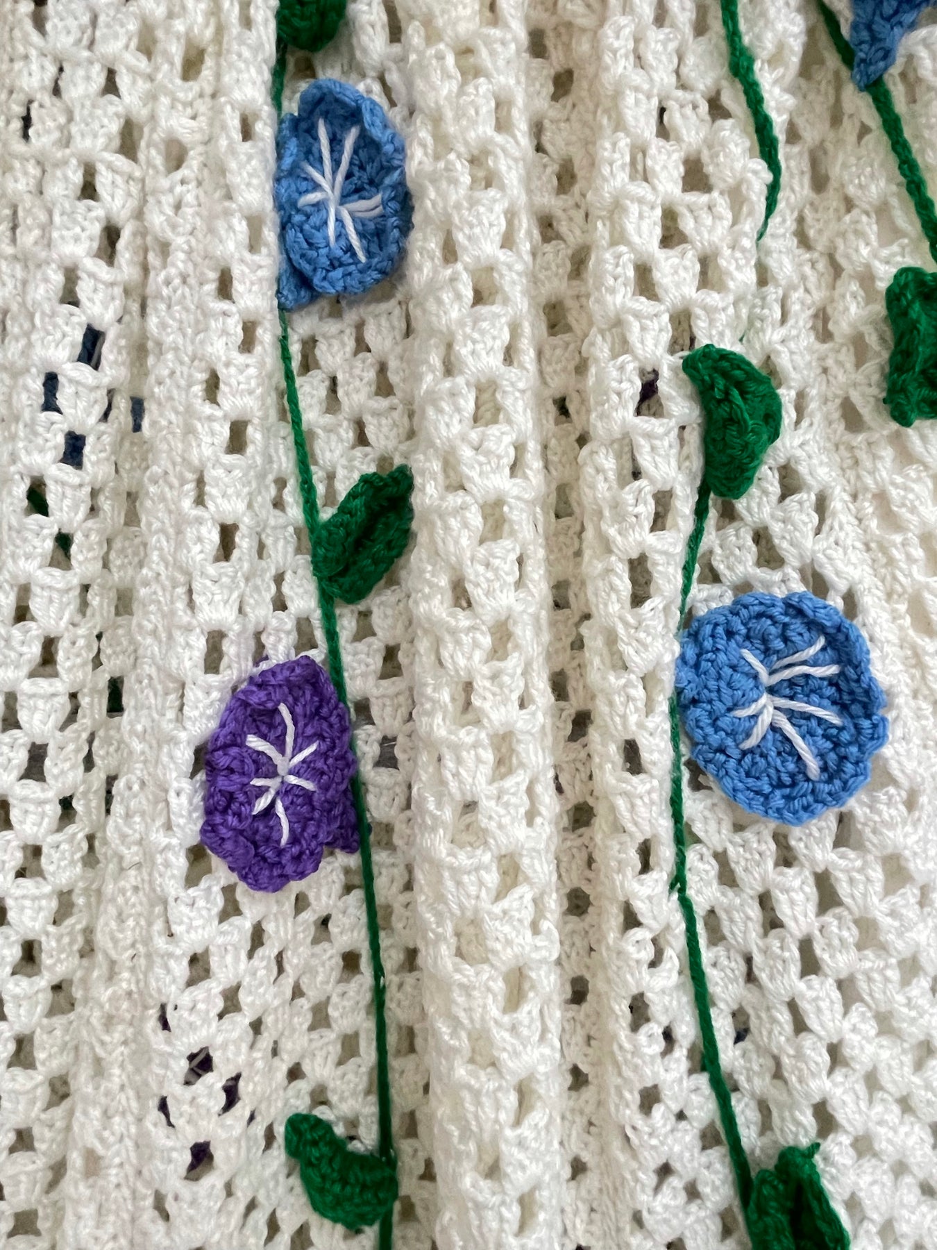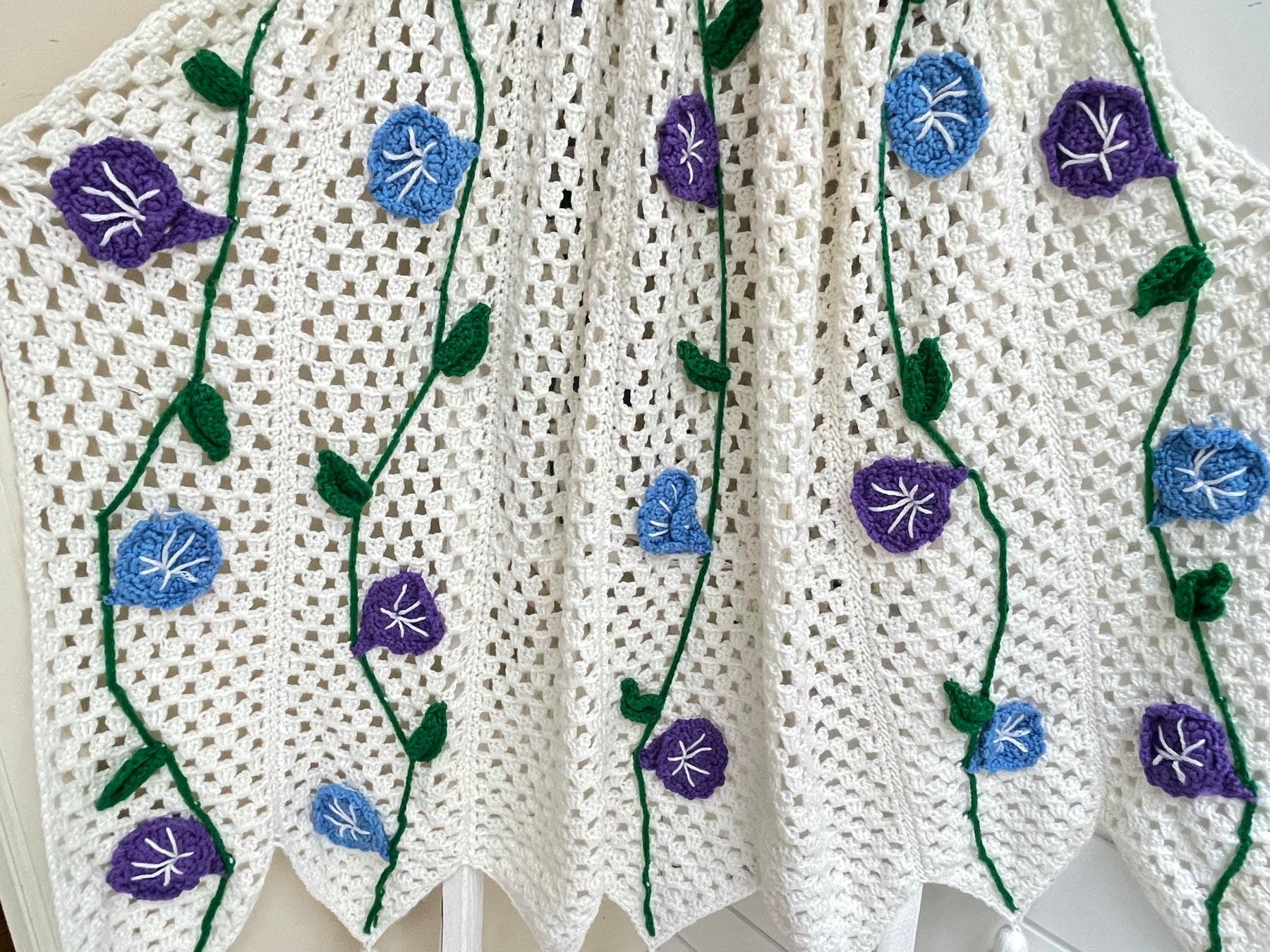 Set against a crisp white background, this afghan features graceful blue and purple morning glory motifs that evoke calm mornings, fresh air, and the quiet beauty of nature in bloom. The soft color palette and floral design create a serene yet striking blanket that feels timeless and elegant.