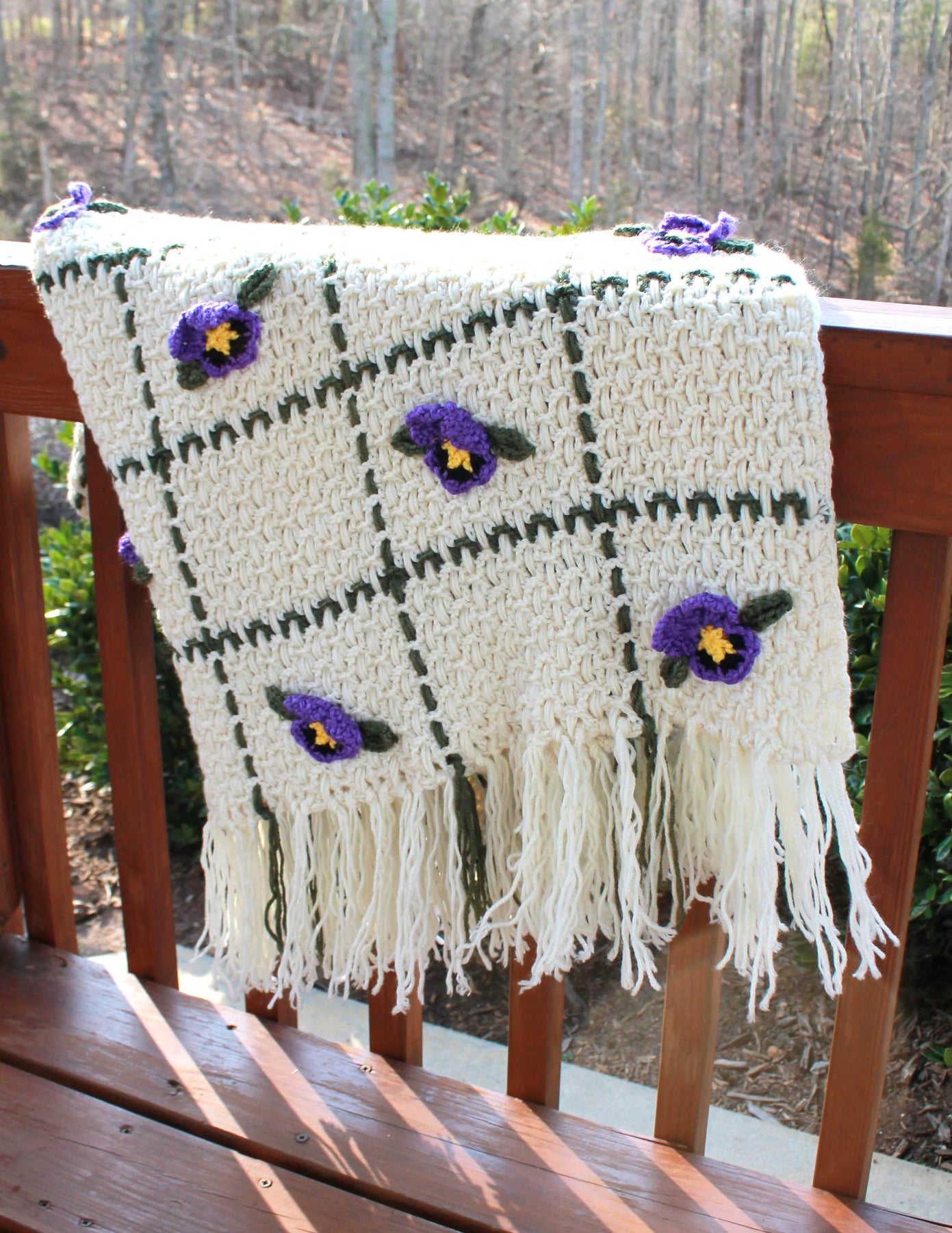 Featuring elegant purple pansy flowers, this afghan showcases horizontal rows of open spaces with woven yarn creating a delicate plaid effect. The fringed edges add a charming, finished touch, making it a cozy and eye-catching statement piece for any room.